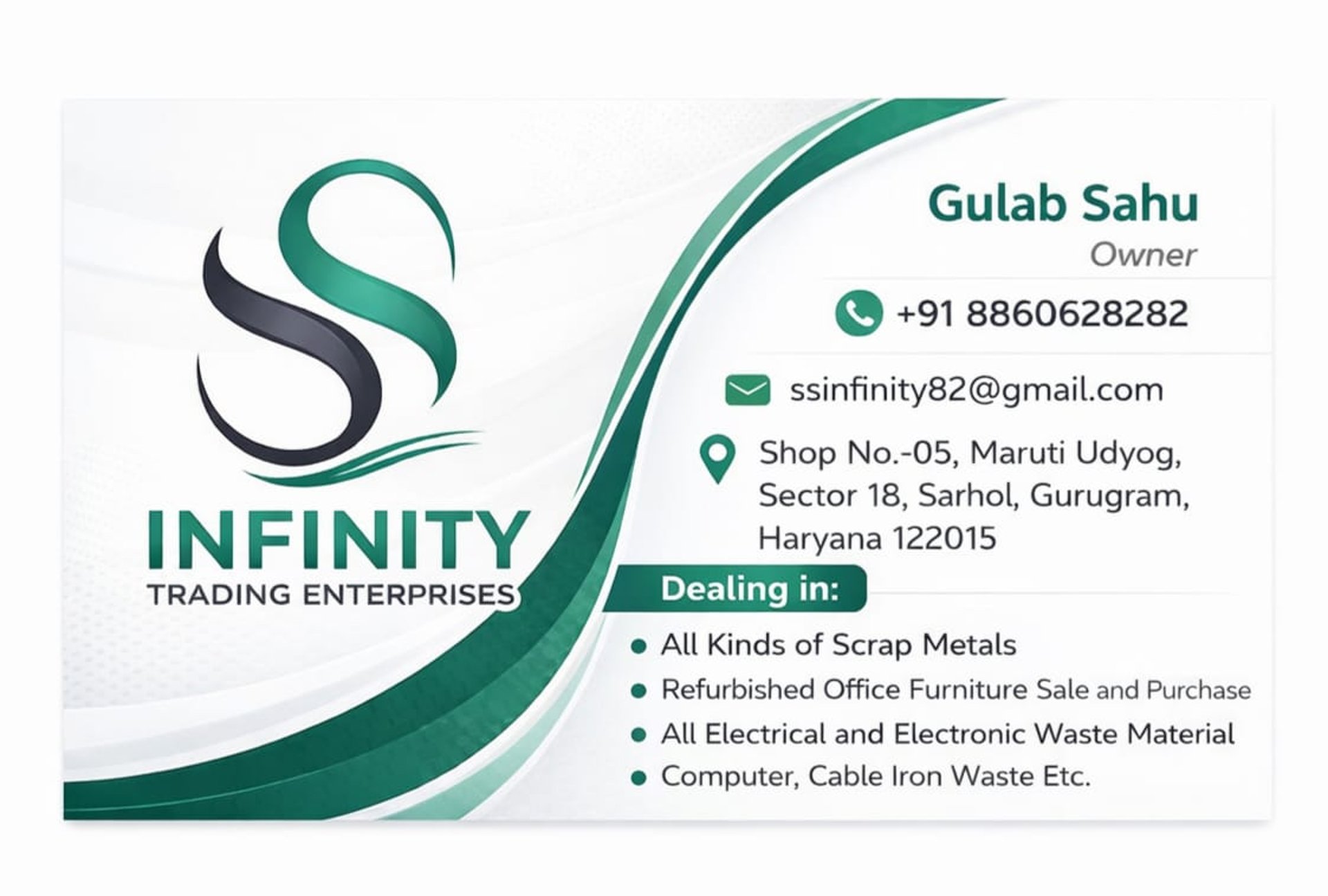 SS Infinity Trading Enterprises is a trusted scrap and waste material dealer run by Mr. Gulab Sahu located at Maruti Udyog, Sector 18, Sarhaul, Gurugram. We deal in all types of scrap materials, including iron scrap, battery scrap, cables, computer scrap, and electronic & electrical waste material. We also deal in office furniture sale and purchase at affordable and competitive prices. With transparent dealings and fair rates, we ensure reliable services for businesses and individuals. Our team focuses on proper handling and responsible disposal of scrap materials as per industry standards. For bulk scrap or office furniture requirements, customers can contact us directly for quick and reliable assistance.