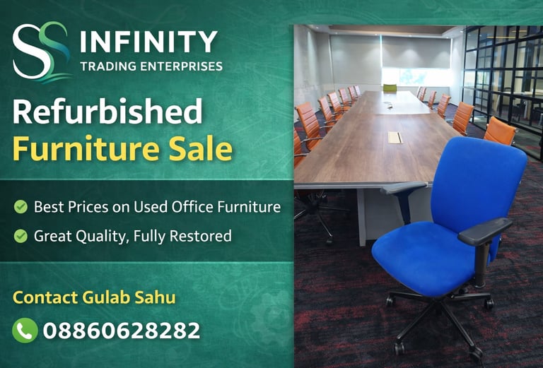 SS Infinity Trading Enterprises offers high-quality refurbished office furniture including workstations, chairs, conference tables, and storage units. Each item is professionally restored, cleaned, and quality-checked to ensure durability and comfort. Get premium office furniture at affordable prices with bulk availability across Gurgaon and Delhi NCR.